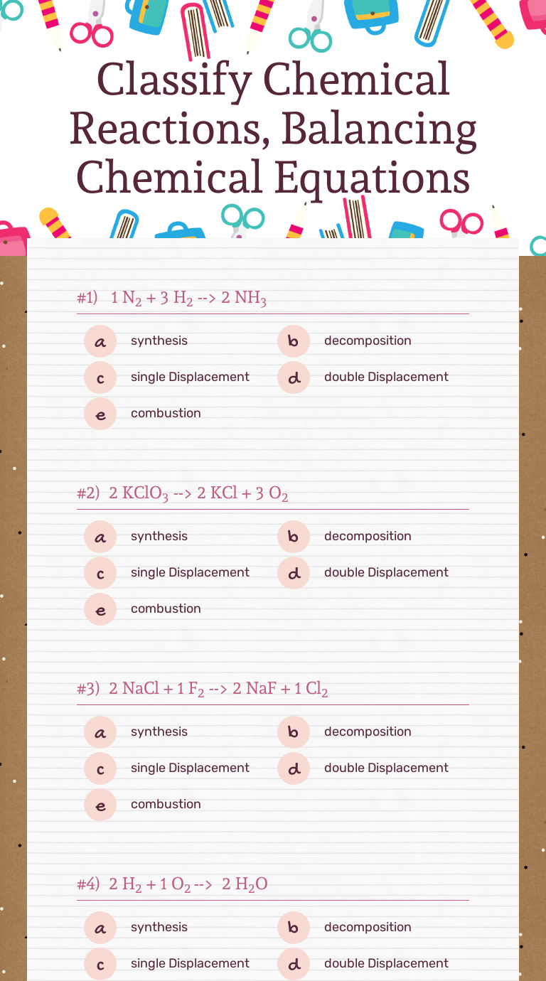 *combination (synthesis) *decomposition *single displacement (single replacement). Given the equation 3a + b → c + d, you react 1 mole of a. Classifying chemical reactions worksheet 1. Comprehensive worksheet containing a variety of questions, including extension and further research. The signs that indicate a reaction are called indicators of a chemical reaction.